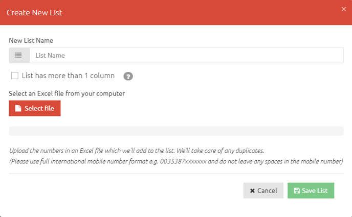 To create a list, select Create new list and the below popup window will be displayed. Lists can be imported from either Microsoft Excel© (.xlsx).