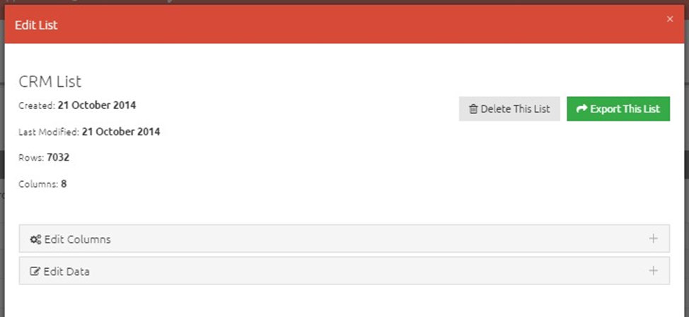 Once you have saved a new list, the above popup will be displayed. Here you can inspect how many rows and columns are contained in the list, as well as the date the list was created on and last modified on. You can also edit the list's data from this popup.