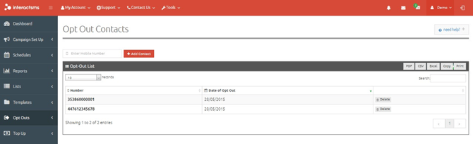 Contacts that have been added to the Opt Outs list can be removed from the list by selecting Delete beside the contact to be removed. Once removed, this user will now be able to receive messages again.