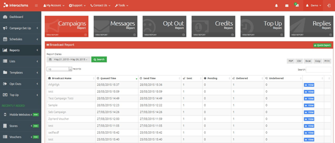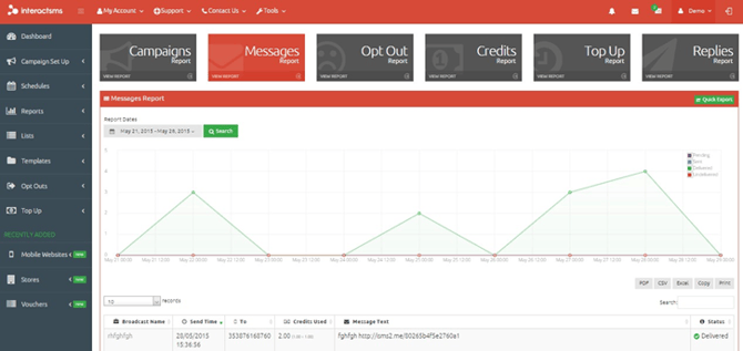 This report details the individual messages sent. Unlike the Campaigns report, this report will detail each SMS within a campaign and list the message text sent.