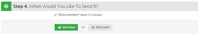 After you have selected either Send Now or Send Later with a campaign to a small number of contacts, if you have also selected the Show summary? option, a popup box will appear that will ask you to confirm your campaign details before sending.