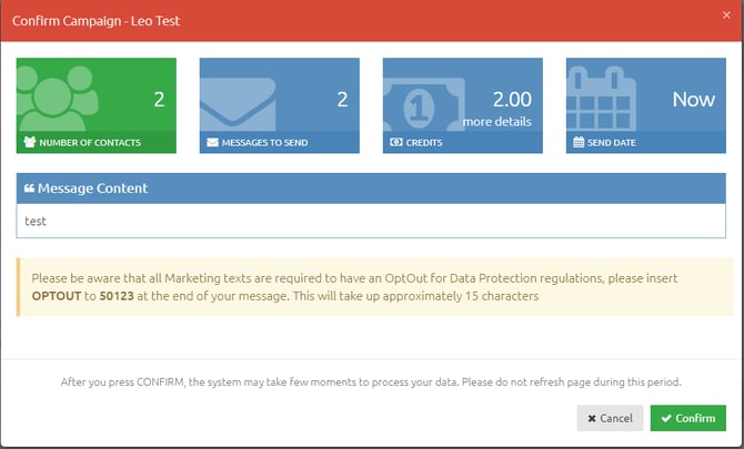 If you select Cancel, the campaign will not be sent, and you will be returned to the Send campaign page to amend or update details. If the details are correct, click Confirm to continue. You will then be redirected to the dashboard, where the results of your message campaign can be viewed.