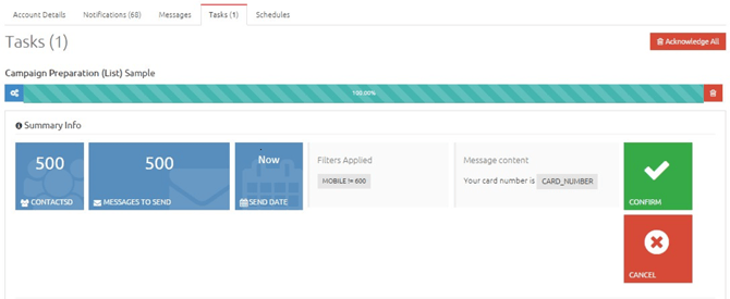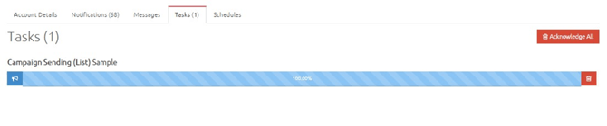 Campaigns to a large number of contacts take a little longer to process. When you send a large campaign you will be taken to the tasks page where you can view the processing of the broadcast. For more information, see the section on Tasks.
