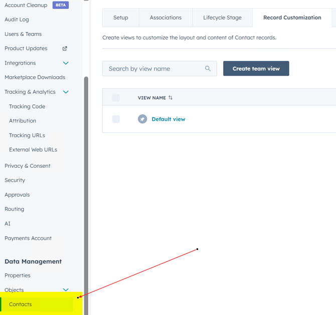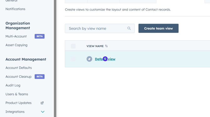 Click on the Default view entry to begin editing the layout for the default contact record view.