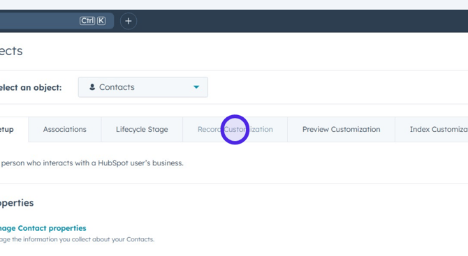 From the profile menu, click on Profile & Preferences, then navigate to the Objects section and select Contacts. Finally, select the Record Customisation tab.