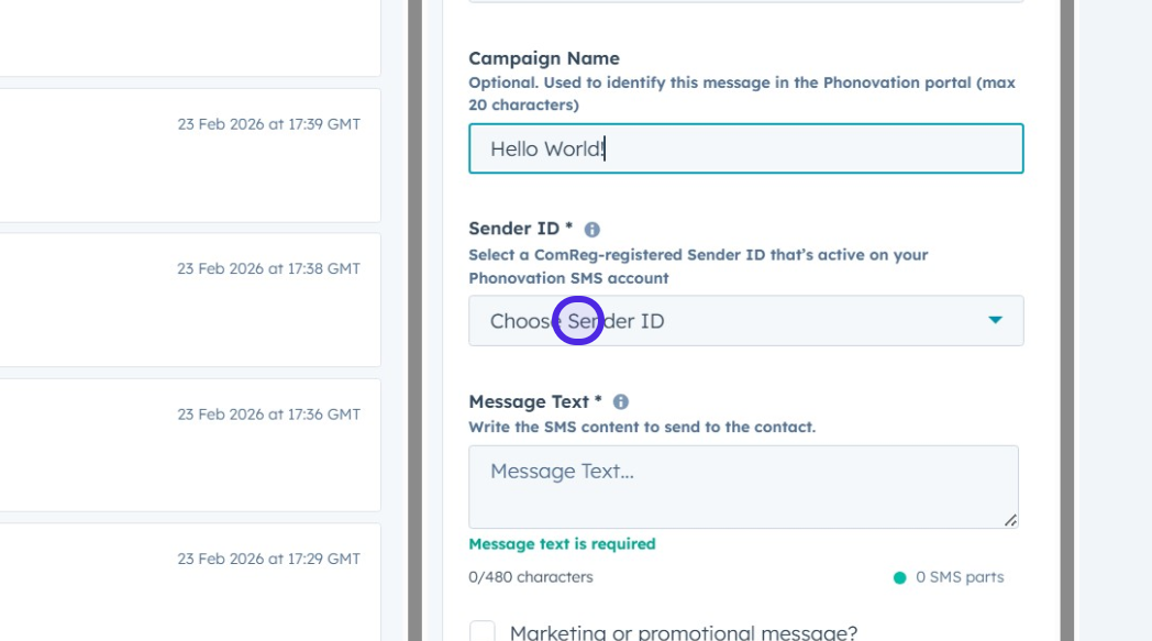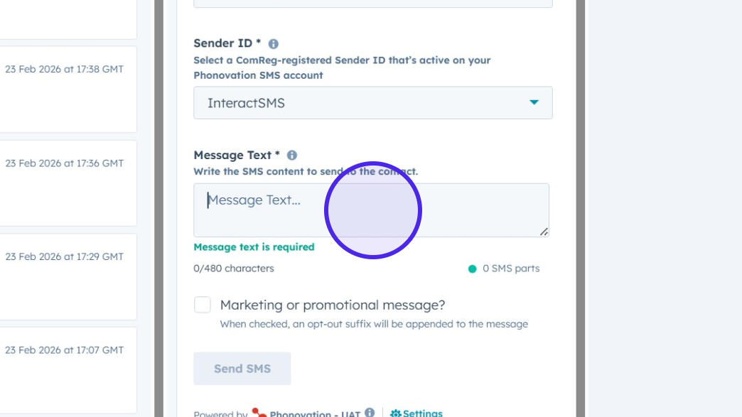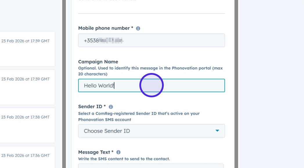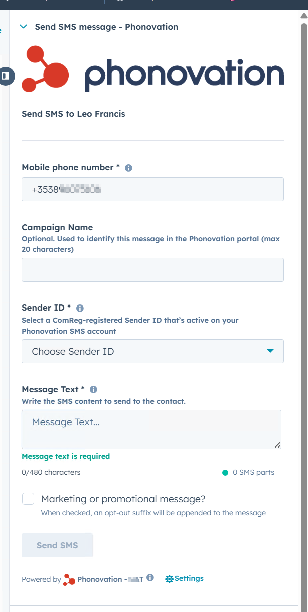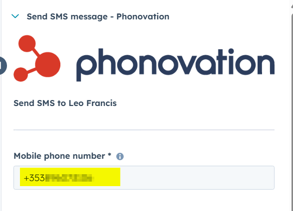 You will see the Mobile Phone Number section is auto filled, this is pulled straight from your contacts "Mobile Phone" property on HubSpot, ensure this is correct before continuing.