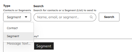 - Under Type, select from the dropdown menu if you want to send to selection of contacts or a segment (in this article we are focusing on Segment's (Lists))